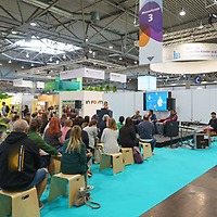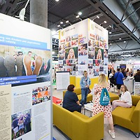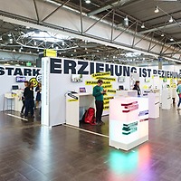 The exhibition stands of the city of Leipzig and the Free State of Saxony were particularly eye-catching. Visible from afar, the central motif of Leipzig's presentation was the radiant laughter of children, surrounded by individual discussion corners, information pillars, and areas for presentations and activities. The Free State of Saxony and the Saxon State Ministry for Social Affairs, Health, and Social Cohesion presented themselves under the motto “Loud today, strong tomorrow – child and youth welfare as a location factor” on 1,300 square meters. The design, with strong messages in eye-catching lettering and bright colors, connected all the stand elements – from the container with a roof terrace to the stage with an LED wall and activity areas to the presentation of more than 100 organizations and projects from the Saxon child and youth welfare landscape in ten thematic areas.